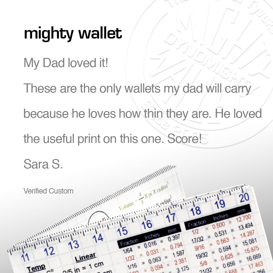 The Mighty Wallet is the perfect gift for the guy who has everything and it even has an actual size ruler at the top and bottom in centimeters and inches respectively.