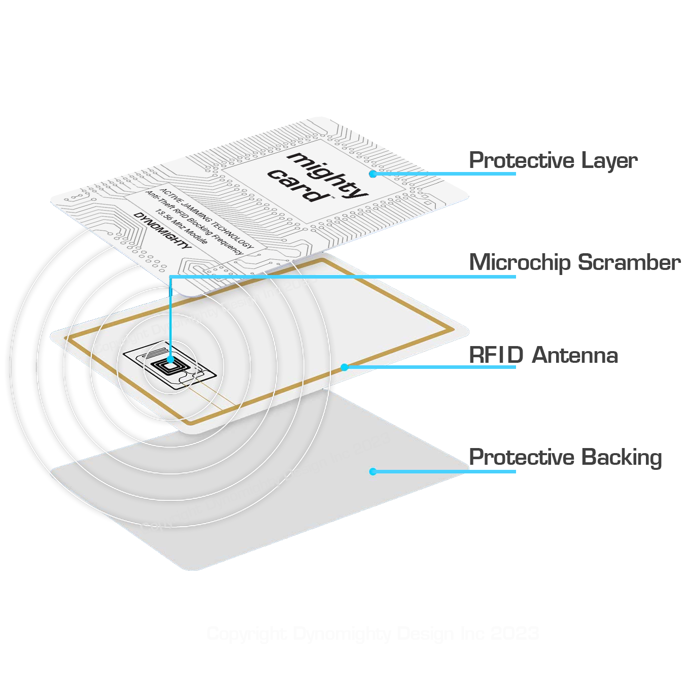 The Mighty Card operates by scrambling the standard frequency of 13.56 MHz used by these cards, effectively blocking unauthorized attempts to access their information.
