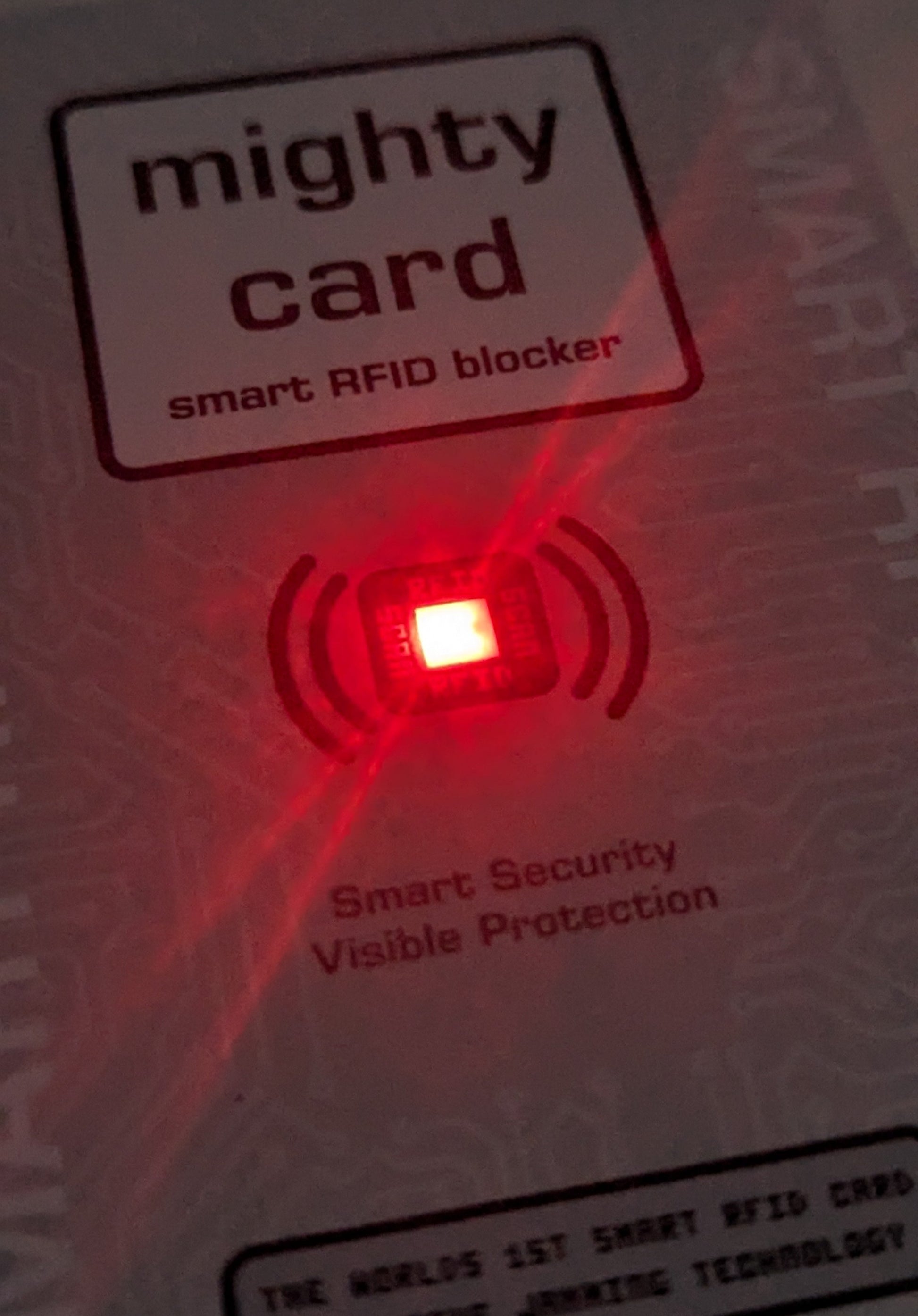It is the worlds first card that harvests the energy in the RFID signal to light this small LED light visibly showing you it's active and adding extra protection to your wallet.