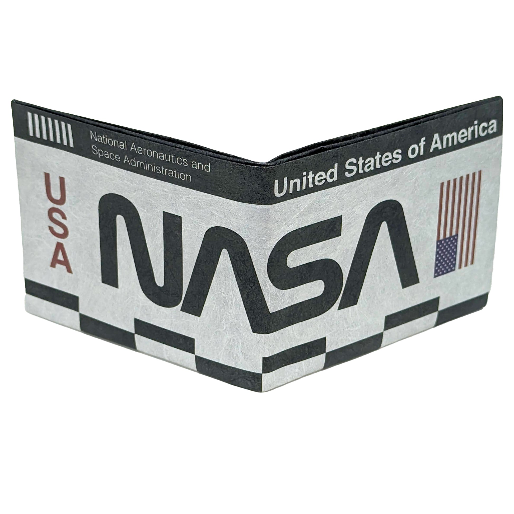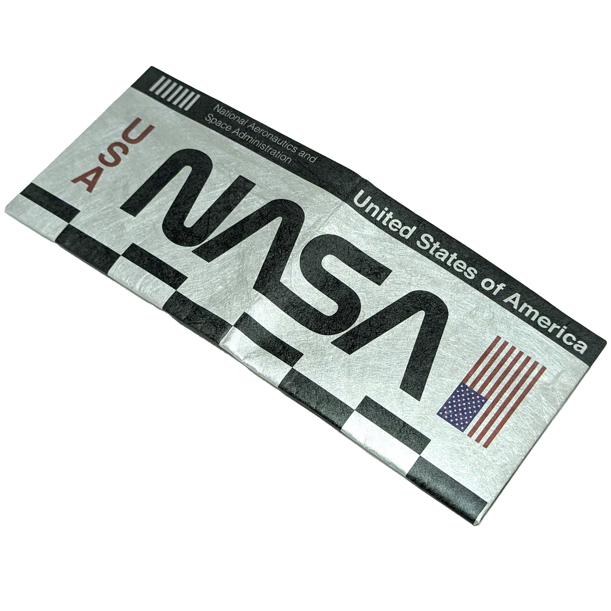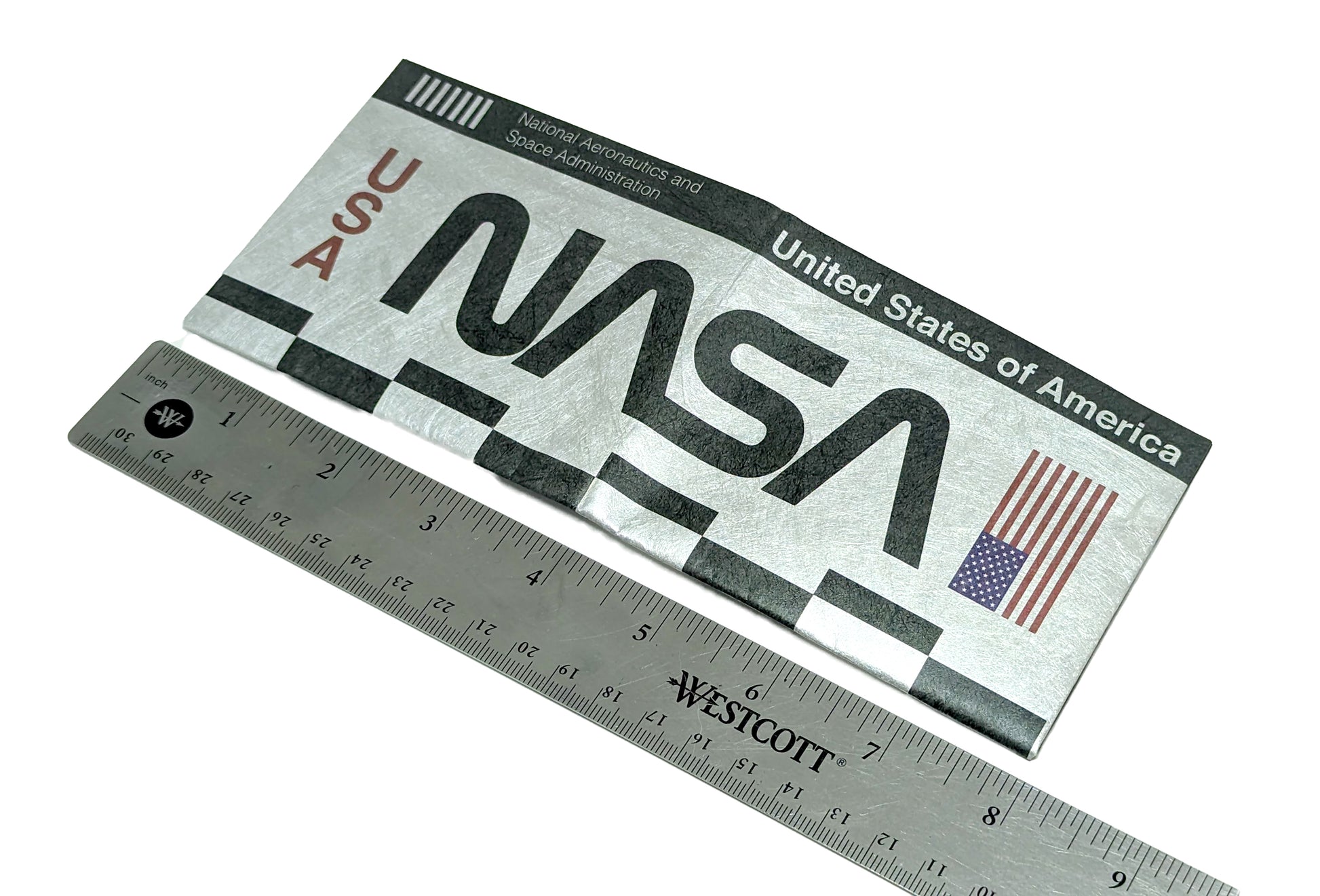 The wallet features the iconic "Worm Logo" design which will accompany the new Artemis rocket flights back to the moon. The black and white checkers at the bottom of the design also double as a one inch ruler.