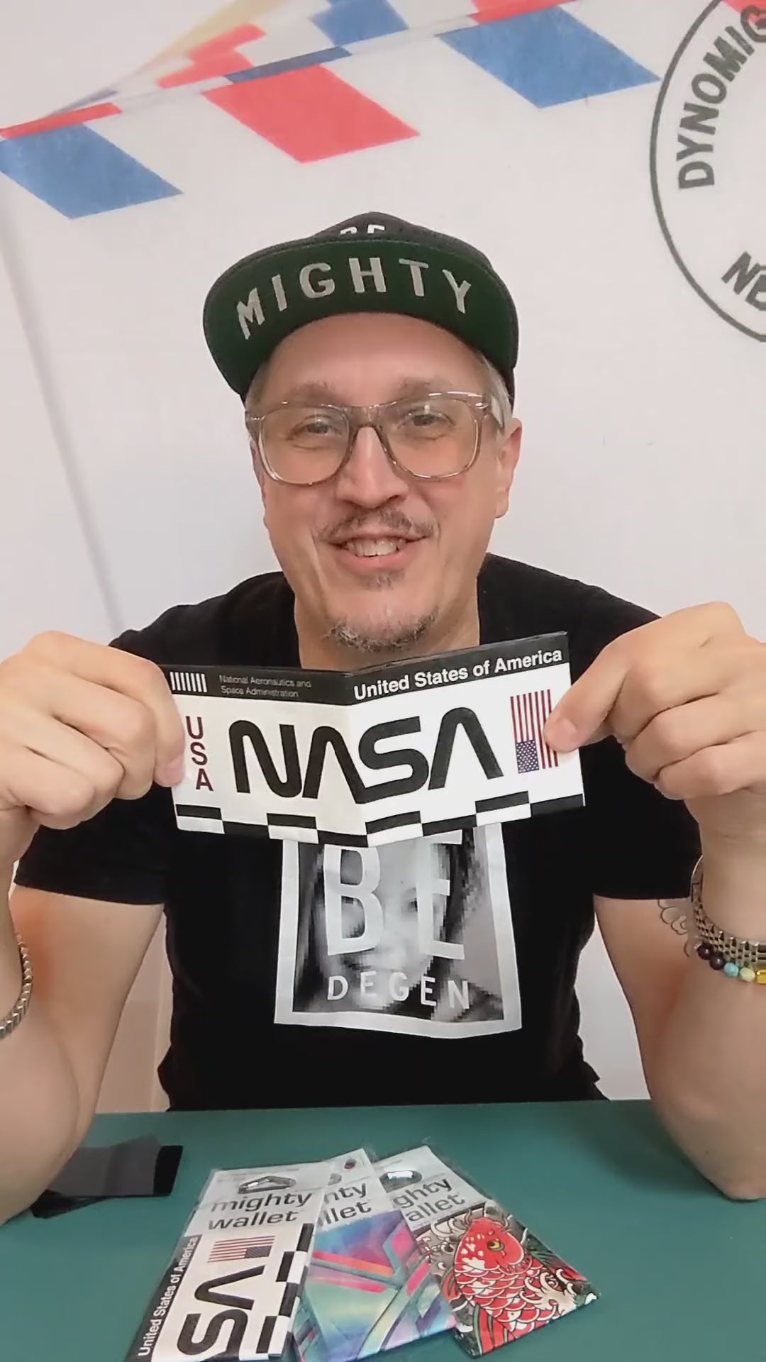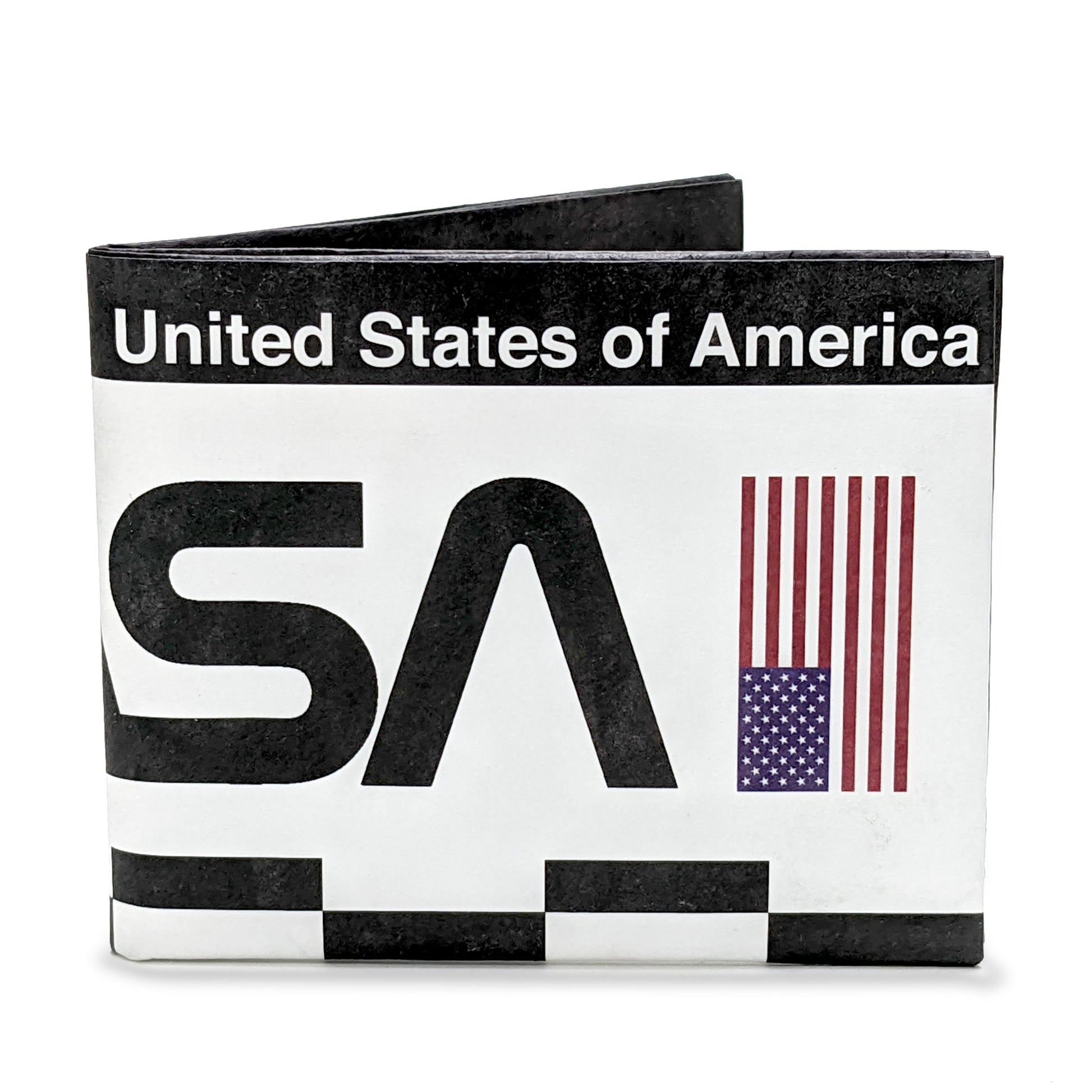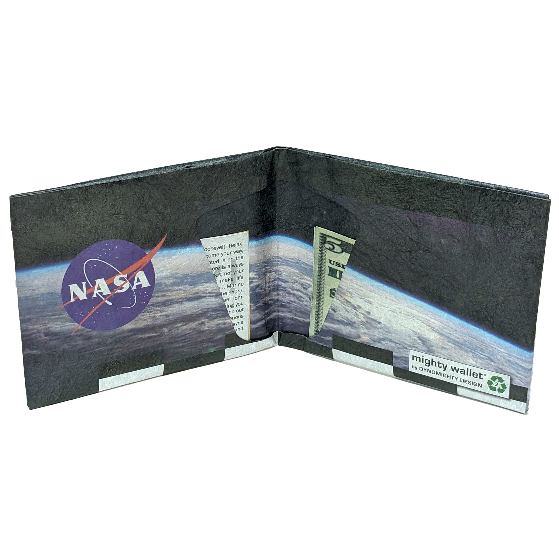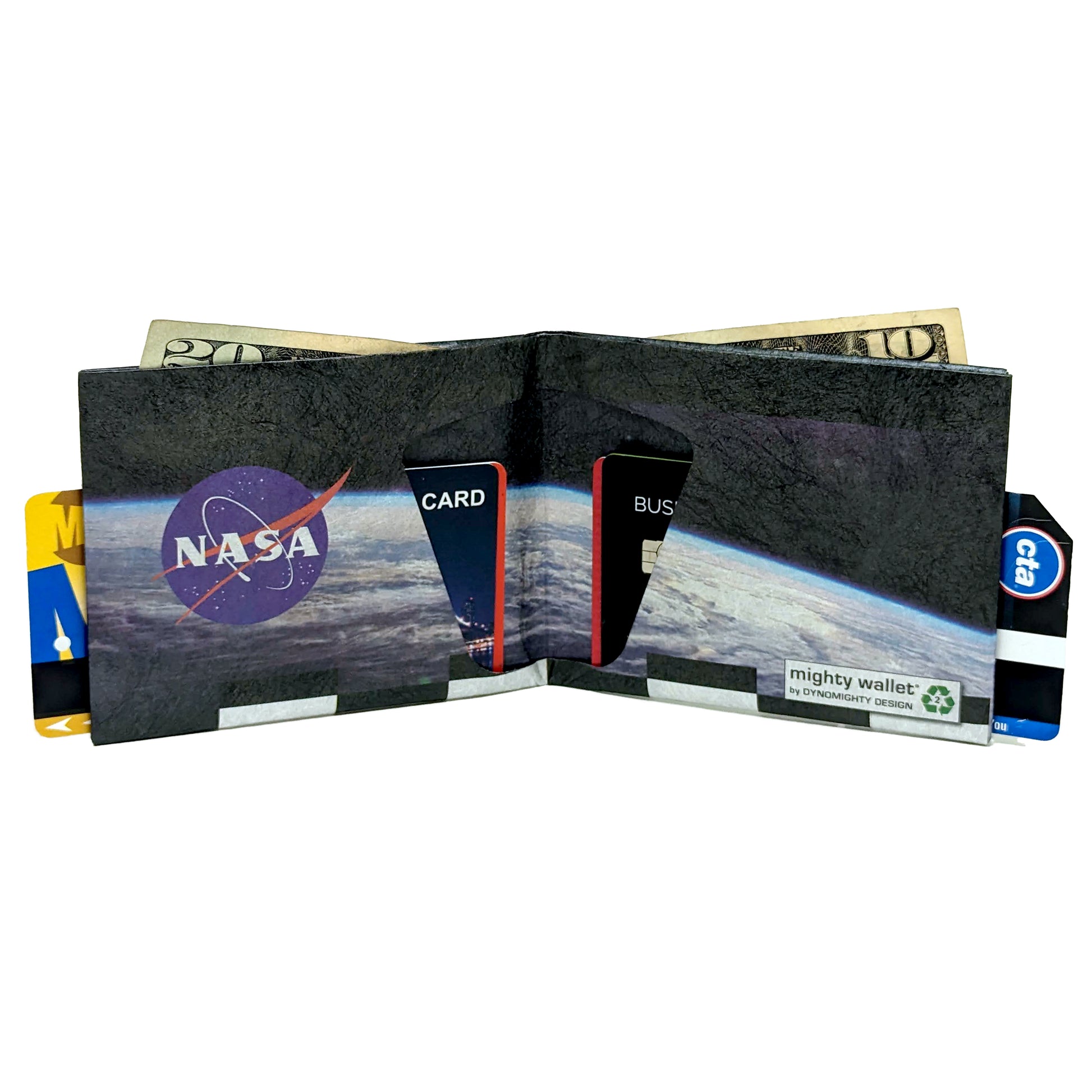 The wallet features the iconic "Worm Logo" design which will accompany the new Artemis rocket flights back to the moon. The black and white checkers at the bottom of the design also double as a one inch ruler.